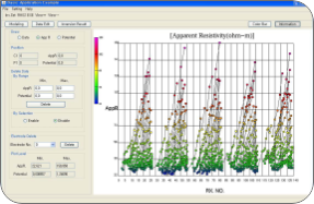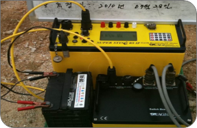 이때 발생되는 전위를 여러 측점에서 측정하고, 그 결과를 이용하여 지반의 전기적인 성질인 전기비저항 분포를 추정하는 탐사법이다.